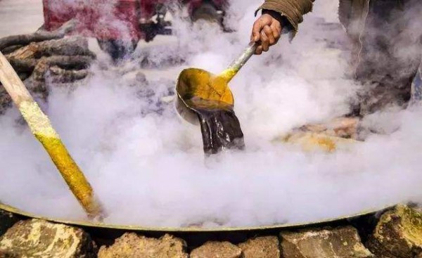 (4)邊熬制邊攪,使溶液受熱均勻,熬沸后保持50-60分鐘,鍋內溶液呈深棕紅色時,停火。