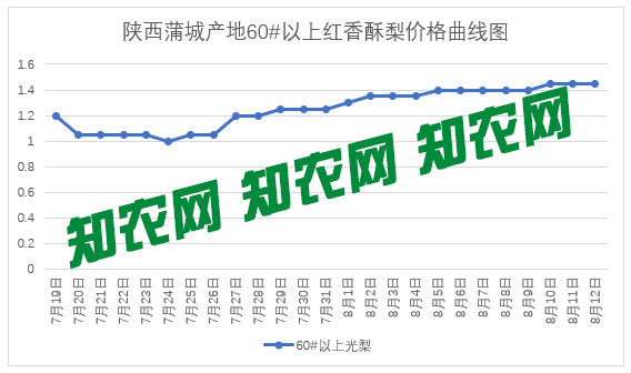 目前,陜西蒲城產區紅香酥梨收購難度增大。目前,陜西蒲城產區紅香酥梨收購難度增大。價格一直在漲,讓一些收購商望而卻步,但收購難度卻沒有絲毫減小。在此提醒廣大果農見好就收,再好的價格期望值都抵不住一場大風,同時希望有關職能部門盡快完善農業保險降低因災致貧的可能性。下圖是近期陜西蒲城紅香酥梨收購價的走勢圖(僅供參考)。