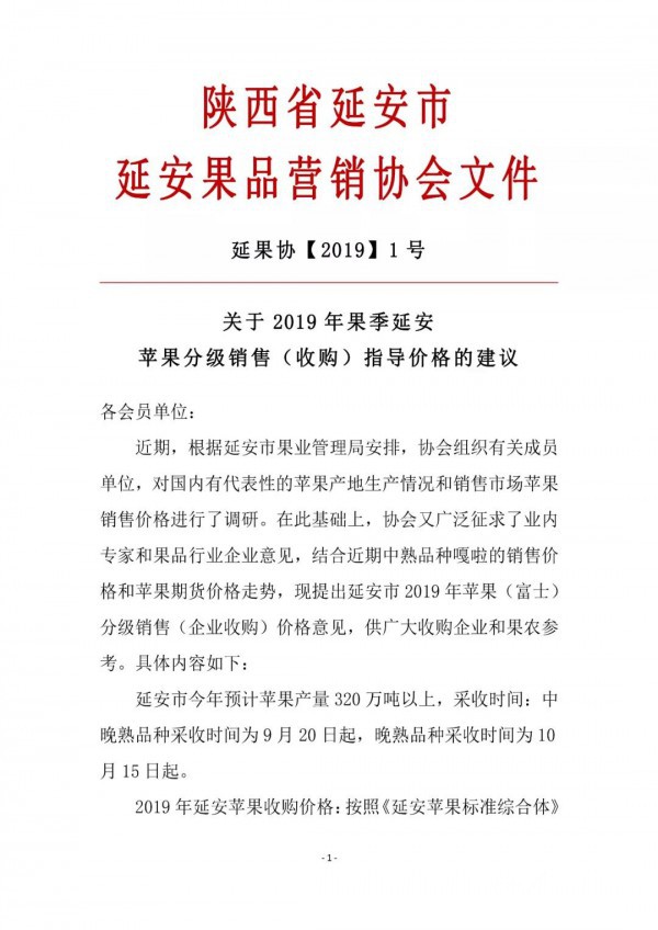 從延安市果品營銷協會獲悉,2019年果季延安蘋果分級銷售(收購)指導價格、采收時間已確認。以下為建議正文:
