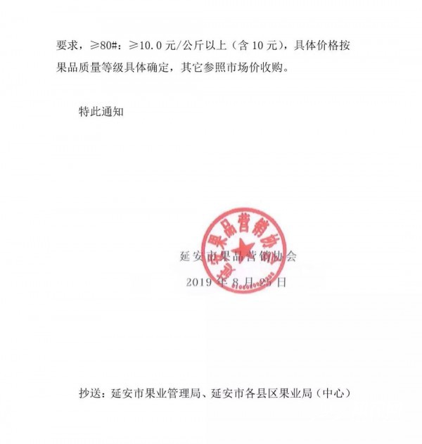 按照《延安蘋果標準綜合體》要求,2019年延安蘋果收購價格: