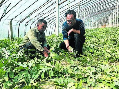 昨日,記者來到明村鎮大黃埠村村民張治軍的冬暖大棚。為保證西瓜的產量和品質,每株西瓜都嚴格采取“三蔓一瓜”的種植方式,只留一個瓜。由于田間管理得當,張治軍家的西瓜成熟期在周邊屬于比較早的。