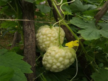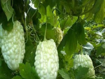 新一代交配品種,蘋果型苦瓜,果面密生亮白珍珠粒,糖度***6度,口感脆甜多汁,果型粗肥,肩形美,早生,生長強健,結果能力強,采收期長,亮麗美觀,單果重500克左右,開花至采收約18天。 肉特厚,苦味清淡適中,口感略有甜爽清涼生津,水分多,適合榨汁飲用,遮光后皮色更為潔白嬌艷,可愛***,全身呈乳白色,看起來像白玉雕刻的一樣,上面的紋路特深,瓜果面上瘤點似粒粒珍珠般,因此有珍珠白玉苦瓜之稱。