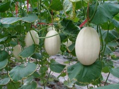 陜西蒲城甜瓜——東方蜜果實橢圓形、白皮帶細紋,單果重1.5公斤左右,橙紅色果肉,厚4厘米左右,肉質松脆、細膩、多汁,含糖量16度左右,口感風味極佳。果實發育期40-45天。